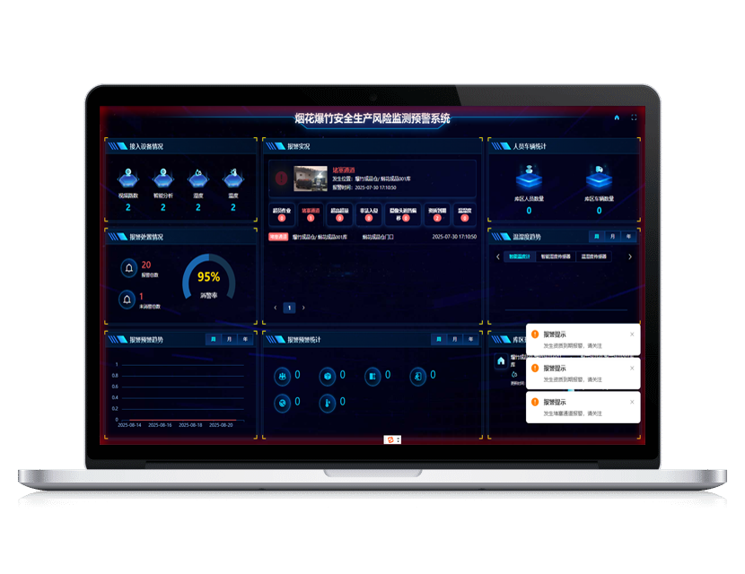 针对烟花爆竹仓库“易燃易爆、怕高温潮湿、需精准管控”的特殊性,系统部署高精度、抗干扰的物联网感知设备,构建“空-地-物”立体化监测网络,实现对关键风险指标的实时、连续、精准采集。