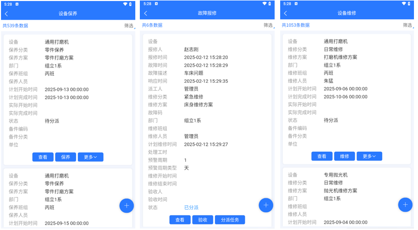支持维修人员通过手机 APP 完成报修、接单、记录维护过程,无需在电脑前操作,提升现场工作效率